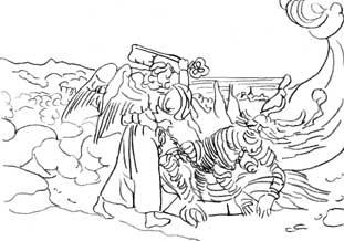 mène le dragon dans l'abîme. Prête à être assommée par l'énorme clef, la Bête est curieusement carapaçonnée. |