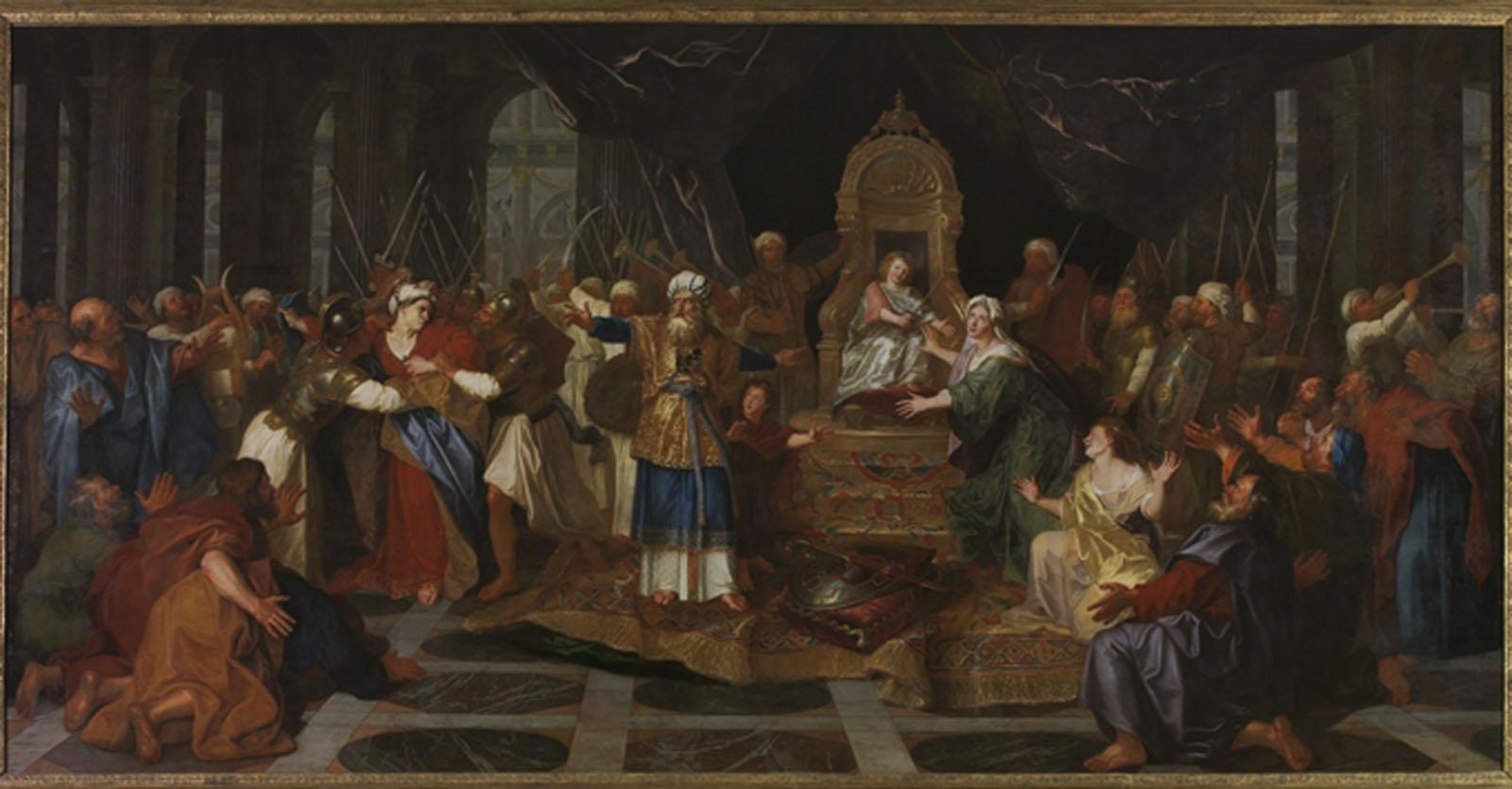 Le tableau représente une scène de la Bible, racontée dans l'Ancien Testament, Athalie chassée du temple (II Livre des Rois, XI). Afin de régner, Athalie a ordonné de massacrer tous les membres de la famille royale. Mais Josabeth, épouse du grand prêtre Joad, a sauvé secrètement Joas, petit fils d'Athalie, âgé de sept ans. L'enfant vient d'être installé sur le trône de Juda et reconnu pour roi par l'armée et le peuple. Furieuse, Athalie pénètre dans le temple en pleine cérémonie et se précipite sur l'enfant. Athalie est conduite hors du temple par les soldats, se débattant et vociférant.