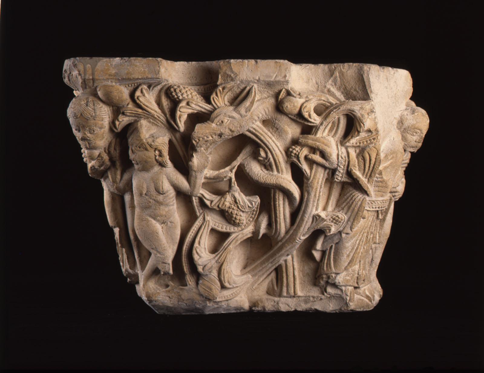 Ce chapiteau provient de l'ancienne abbaye de Corbie située sur les bords de la Somme non loin en amont d'Amiens. C'est l'une des plus riches et des plus illustres de France, fondée entre 657 et 661 par sainte Bathilde. Le chapiteau devait orner le cloître roman de l'abbaye, réédifié en 1152-1153. La composition se déroulant sur la corbeille, évoque les différents épisodes de la Genèse : la création d' Adam, (Genèse, I, 26-30 et II, 7), puis celle d' Eve (Genèse, II, 18-24), le jardin d' Eden et le Péché originel (Genèse, III, 1-8), enfin l'expulsion du Paradis (Genèse, III, 22-24). Elle débute à un angle : la figure de Dieu bénissant Adam peut être interprétée comme la figure du Christ, auréolée d'un nimbe crucifère selon la convention justifiée par le texte ( Jean, XIV, 9) rapportant les paroles du Christ lui-même : « Qui m'a vu a vu le Père ». Au deuxième angle, se trouve à nouveau la figure, aujourd'hui mutilée, de Dieu créant Eve.