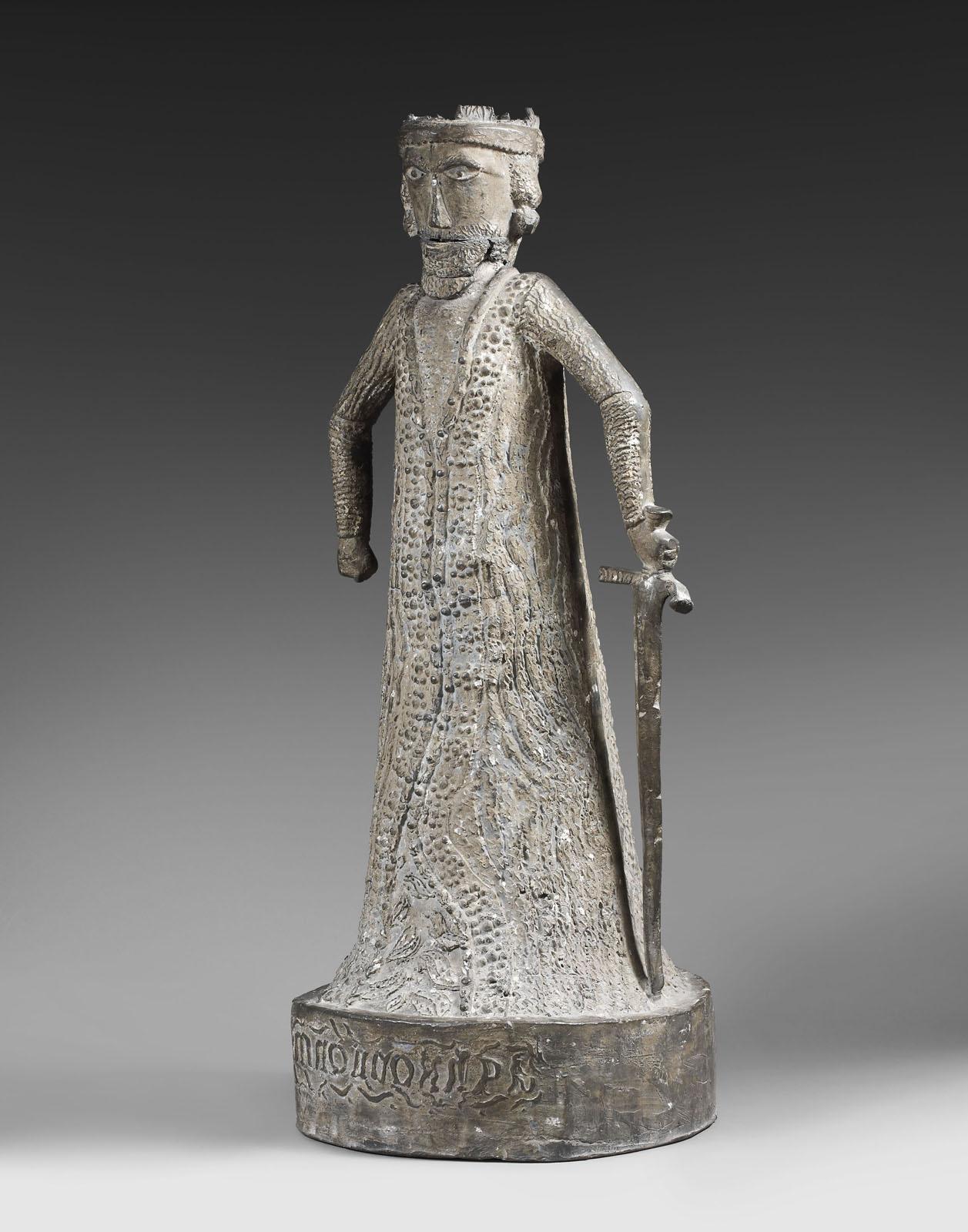 Le personnage en pied, barbu, les cheveux mi-longs et couronné, tient une épée. Il est vêtu d'un manteau décolleté en V orné de passementeries qui descend jusqu'aux pieds. La bouche ouverte qui montre les dents, l'expression fixe des yeux, la façon dont il tient son épée prête à frapper lui donne un aspect particulièrement offensif. Les aspects majestueux et terribles du personnage l'ont fait nommer « Charlemagne » dans les anciens inventaires parce qu'il évoque l'imagerie de l'empereur. Sur la base circulaire une inscription qui aurait pu donner son nom, s'est révélée rétive à toute lecture.