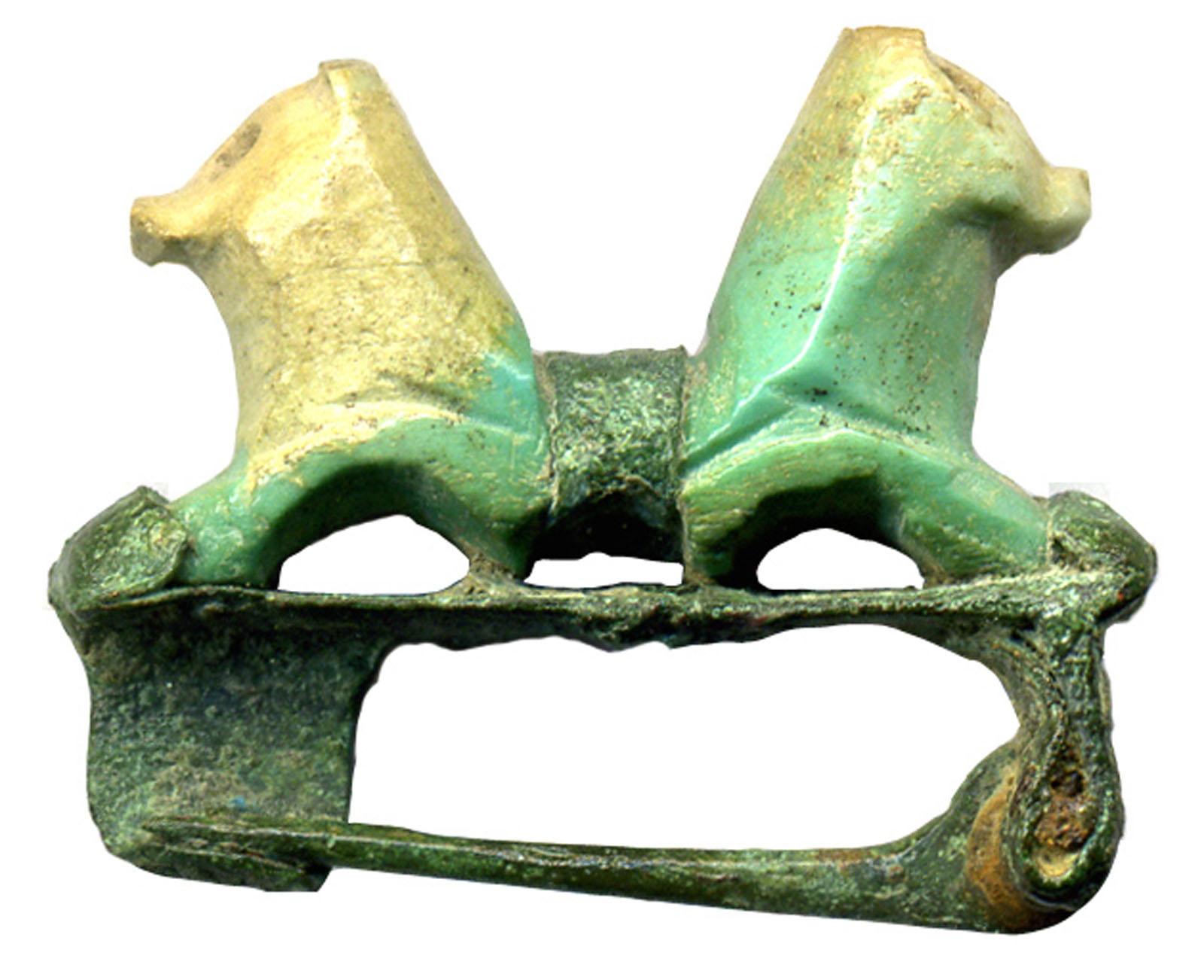 Ancêtre du bouton, cette fibule est du type à goupille s'insérant dans un repli de la tête de l'arc. Le corps de la fibule est constitué d'une plaque de bronze rectangulaire, la charnière étant formée par repli d'une languette fendue vers le dessous. L' ardillon vient s'insérer dans un repli de la tête de l'arc. Particularité de cette fibule, un rabat permet le maintien de sujets en os, deux protomés de lions adossés et fixés sur l'arc par deux replis de métal au pied et à la tête, tandis qu'au milieu, un collier de métal rabattu les solidarise. Une pièce comparable est conservée dans les collections du Musée du Berry (Bourges). Ce type de fibule à arc léontomorphe serait-il fabriqué dans la cité antique de Vendeuil-Caply ? Les fibules à protomés de lion rencontrées le plus souvent sont d'une autre conception. Elles sont notamment à ressort protégé et les protomés, en bronze. Seule la stratigraphie permet de dater cet objet de Tibère-Claude (14-54 après J.-C.).