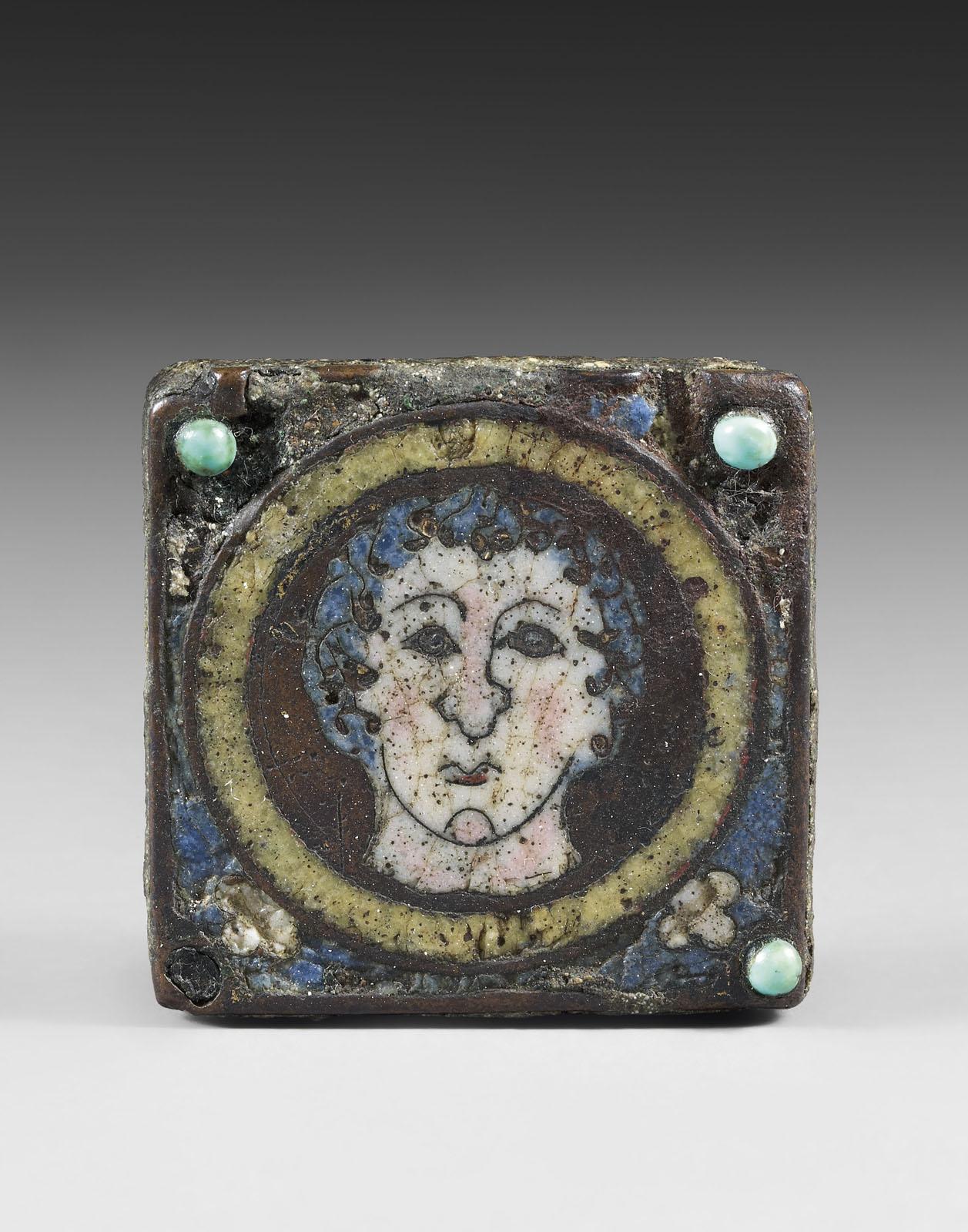 Ce bijou de très grande qualité technique et artistique est orné d'une tête de jeune homme, vue de face, traitée à l'antique. Les traits sont dessinés par des incrustations de fils métalliques, l' émail de la figure est d'un blanc rosé. Les pommettes et la bouche sont marquées de rouge ; les yeux sont faits d'un mince filet d'or formant pupille, les cheveux bouclés sont bleutés. La tête repose sur un cercle lui même inscrit dans une bande circulaire ocre. La forme carrée est rattrapée aux angles par un décor d'émail bleu orné de motifs en trèfles blancs et terminé par une turquoise à chacun des angles.