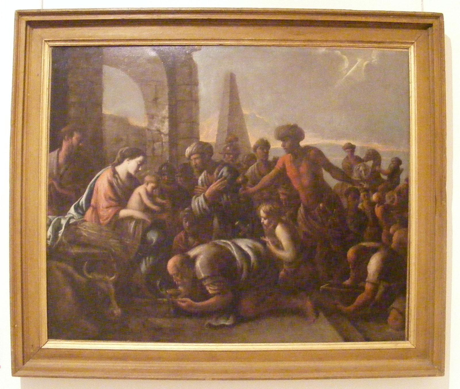 Connu pour ses peintures d'histoire, ses scènes de genre et ses portraits, Mathieu Le Nain, dit « Le Chevalier » s'illustra notamment dans la mise en scènes de gentilshommes. Ses œuvres, ainsi que celles de ses frères, illustre l'influence du Caravage sur la peinture française du XVIIe siècle. D'après l' Évangile selon Matthieu, une étoile a alerté les mages d'Orient, Gaspard, Melchior et Balthazar, de la naissance d'un roi. Guidés par cette dernière, ils découvrent l'Enfant Jésus au sein d'une étable de Bethléem et lui offrent l'Or, l'Encens et la Myrrhe. Ici le schéma de composition est caractéristique du XVIIe siècle : l'Adoration des Mages est accompagnée de l'Adoration des Bergers, ce qui confère à la scène un caractère anecdotique.
