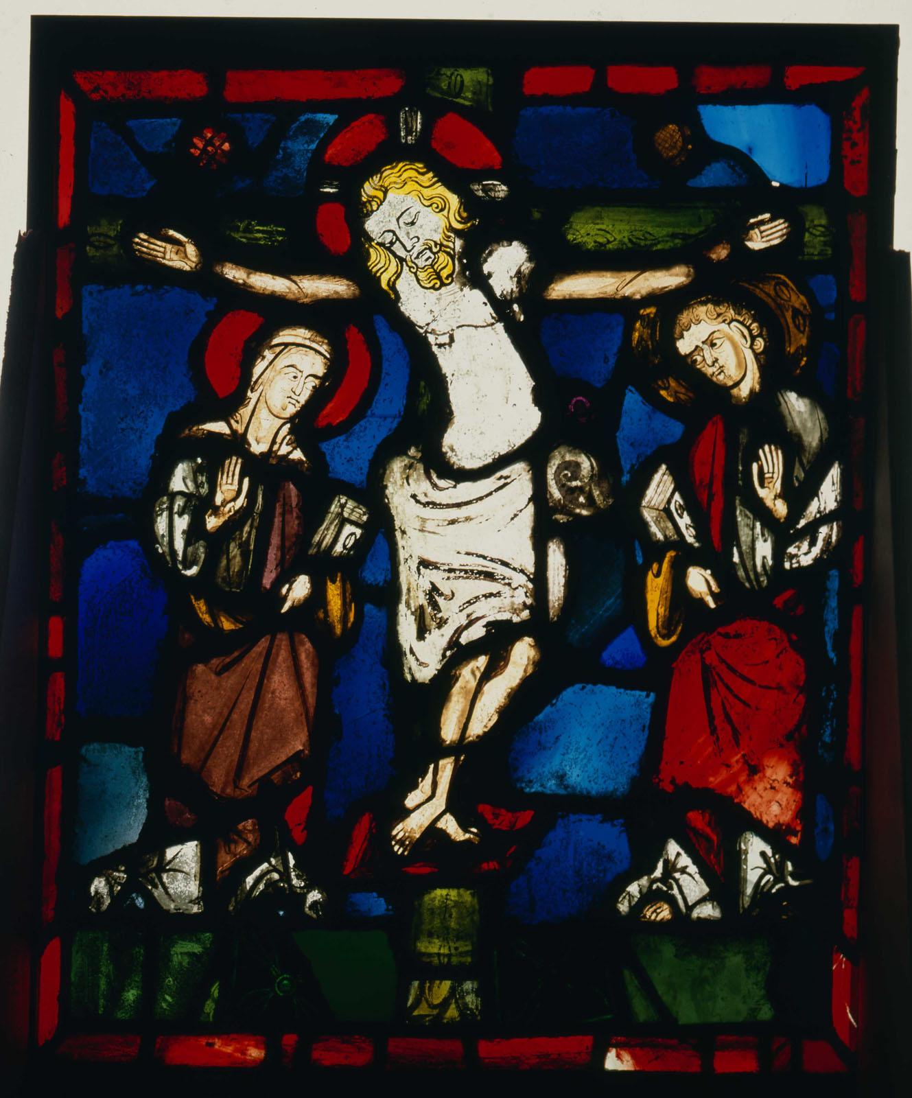 Néanmoins la tête du Christ fut ici remaniée vers le XIVe siècle, comme l'indique l'emploi du jaune d'argent pour représenter la barbe et la chevelure. La couleur « jaune d'argent » est obtenue par des sels d'argent contenus dans de l'ocre et généralement passée au revers des pièces de verre. Appliquée sur des verres teintés dans la masse, elle modifie et multiplie par transparence les effets colorés. Sur un verre bleu, on obtient un vert, ou bien encore sur un verre vert clair, ce dernier devient plus foncé. Grâce à cette technique, on peut désormais varier les couleurs sur une même pièce de verre sans la découper et sans la séparer par un plomb. Cela permet d'alléger les formes, de limiter l'usage des plombs pour obtenir une plus grande lisibilité du vitrail et, de ce fait, une plus grande clarté dans l'édifice. C'est une innovation qui va révolutionner non seulement la technique de fabrication des vitraux, à partir du XIVe siècle mais également introduire des développements esthétiques nouveaux.