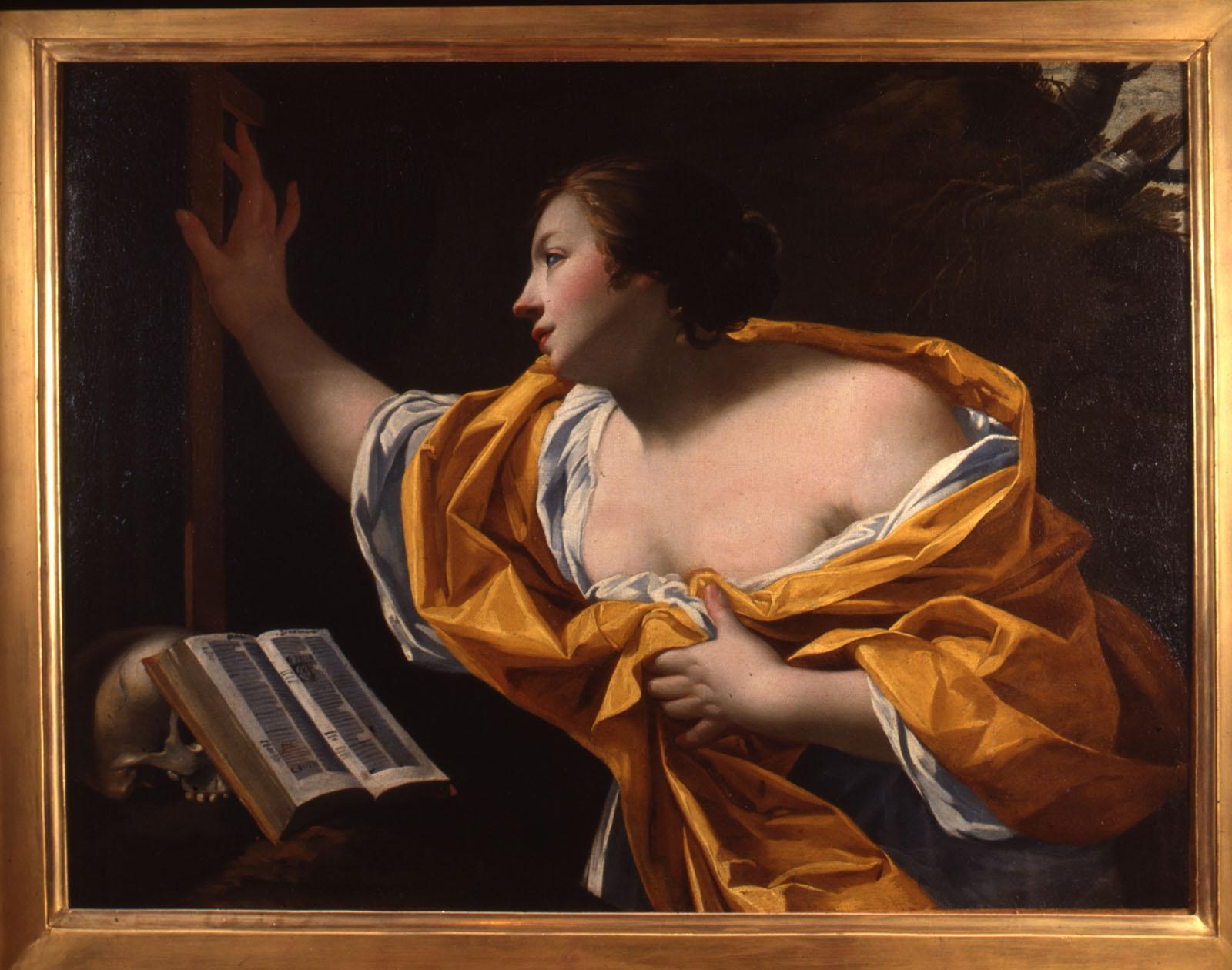 La figure de Marie Madeleine constitue en réalité la synthèse de quatre saintes femmes citées dans les Écritures : Marie de Magdala, la première à rencontrer le Christ ressuscité, Marie de Béthanie, sœur de Lazare et de Marthe, Marie l'Égyptienne, sainte ermite retirée au désert, et une pécheresse anonyme qui lave les pieds du Christ et les essuie de ses cheveux lors du repas chez Simon. Devenue au fil des siècles l'incarnation de la pécheresse repentie, considérée dès lors comme un modèle de la pénitence, Marie Madeleine fut l'une des figures favorites de la Contre-réforme : à une époque où l'Église catholique, alors très critiquée, visait à reconquérir les régions acquises progressivement à la cause protestante, Marie Madeleine illustrait en effet la force du sentiment religieux. Les symboles d'austérité qui lui étaient généralement attachés rapprochaient par ailleurs ses portraits de la catégorie des vanités : la Croix, la Bible et le crâne représentés ici par Simon Vouet devaient ainsi évoquer la vie contemplative menée par la sainte femme. Cette effigie ambiguë, icône religieuse tout en volupté, pudique et sensuelle à la fois, était en outre toujours représentée resplendissante de beauté. Elle revêtait ici vraisemblablement les traits de la première épouse italienne de Vouet, Virginia da Vezzo.