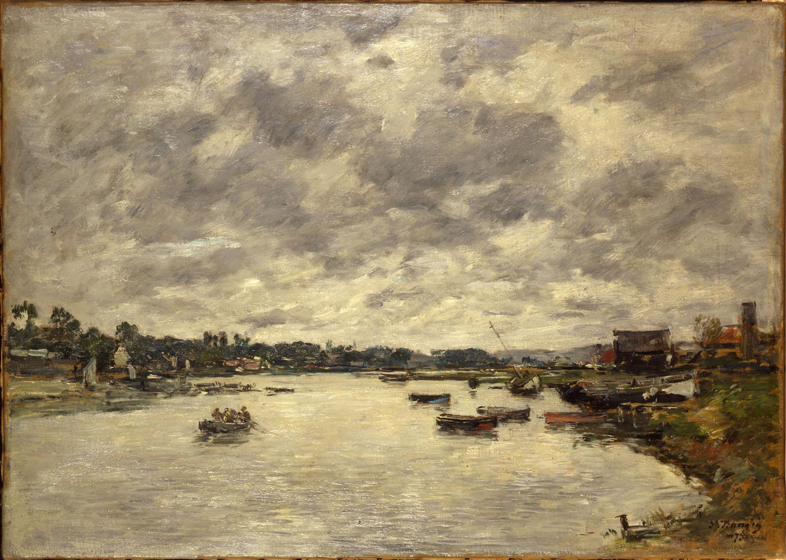 L'importance du ciel et des effets atmosphériques dans les peintures de Boudin lui valut d'être surnommé le « roi des ciels » par le peintre français Camille Corot. Il attachait en effet une grande importance au soleil, aux nuages, au ciel et à leurs effets changeants sur le paysage en mouvement. Boudin ne se livre pas à une description réaliste des bords de la Touques : il se limite, au contraire, à restituer le fleuve dans ses masses et ses principales articulations. Son souci est davantage de restituer une impression reçue dans des conditions atmosphériques précises : celles qui prévalaient probablement lorsqu'il exécuta cette œuvre, ici un temps nuageux. Eugène Boudin s'avoue peintre de la lumière et de ses variations et précurseur dans ce domaine du mouvement impressionniste dont il est considéré comme l'un des initiateurs. Il s'agit d'une vue générale de la Touques, un fleuve côtier qui se jette dans la Manche à Trouville. Le peintre représente le cours d'eau et ses fonctions essentielles (l'activité qu'il y a sur le fleuve et sur ses berges).