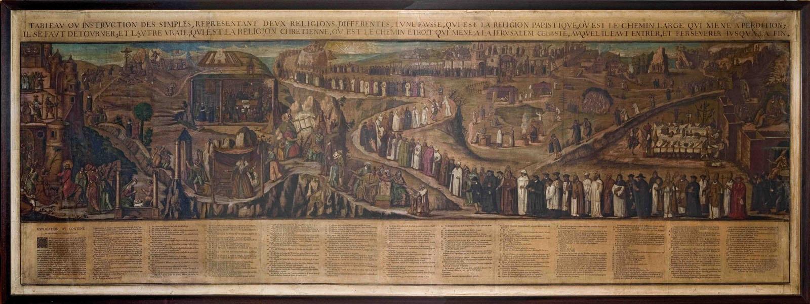 Il s'agit d'une gravure sur bois du XVIIe siècle d'après une œuvre de Nic Anglois de 1584. Cette gravure aquarellée présente de manière allégorique les deux religions catholique et protestante. La religion catholique est dépeinte de manière satirique. L'auteur dénonce l'orgueil, l'idolâtrie, la superstition, la vénalité et la cruauté supposée de l'Eglise papiste. En parallèle, il est mis en avant la simplicité, la rigueur de la vraie religion chrétienne, le protestantisme.