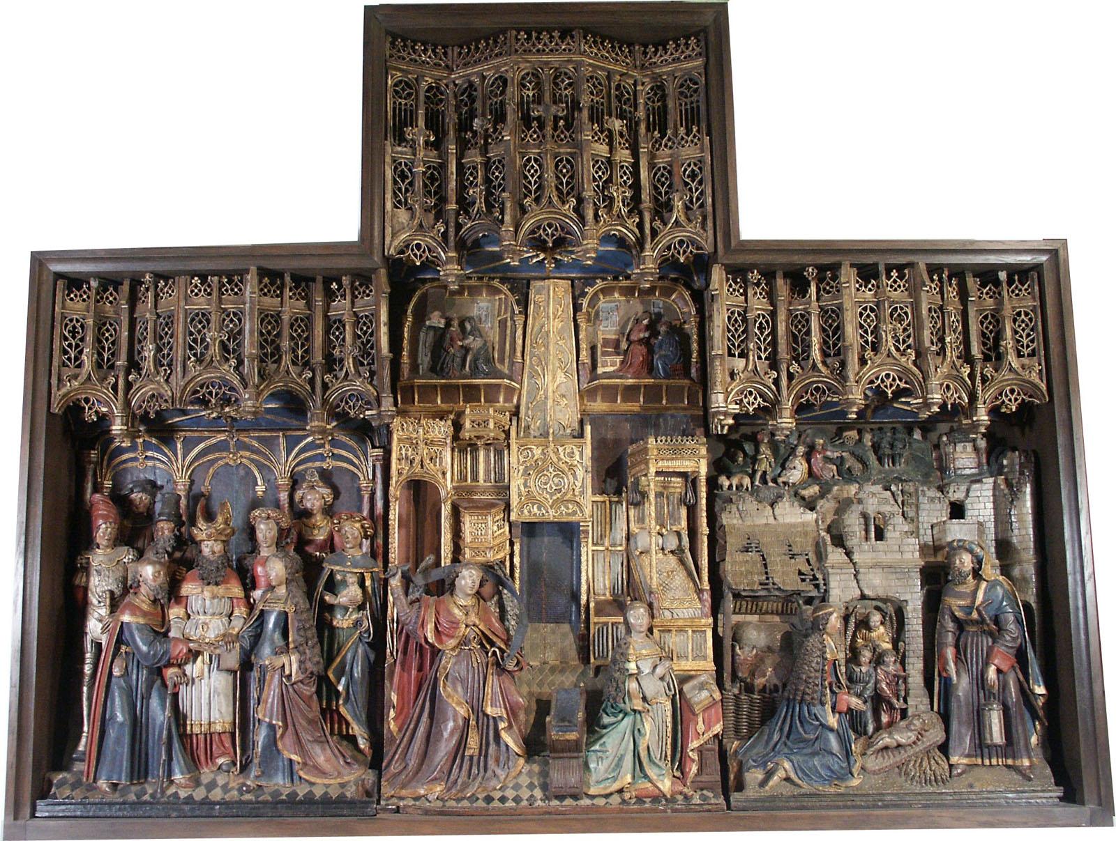 Le retable de la Vie de la Vierge présente une composition tripartite.