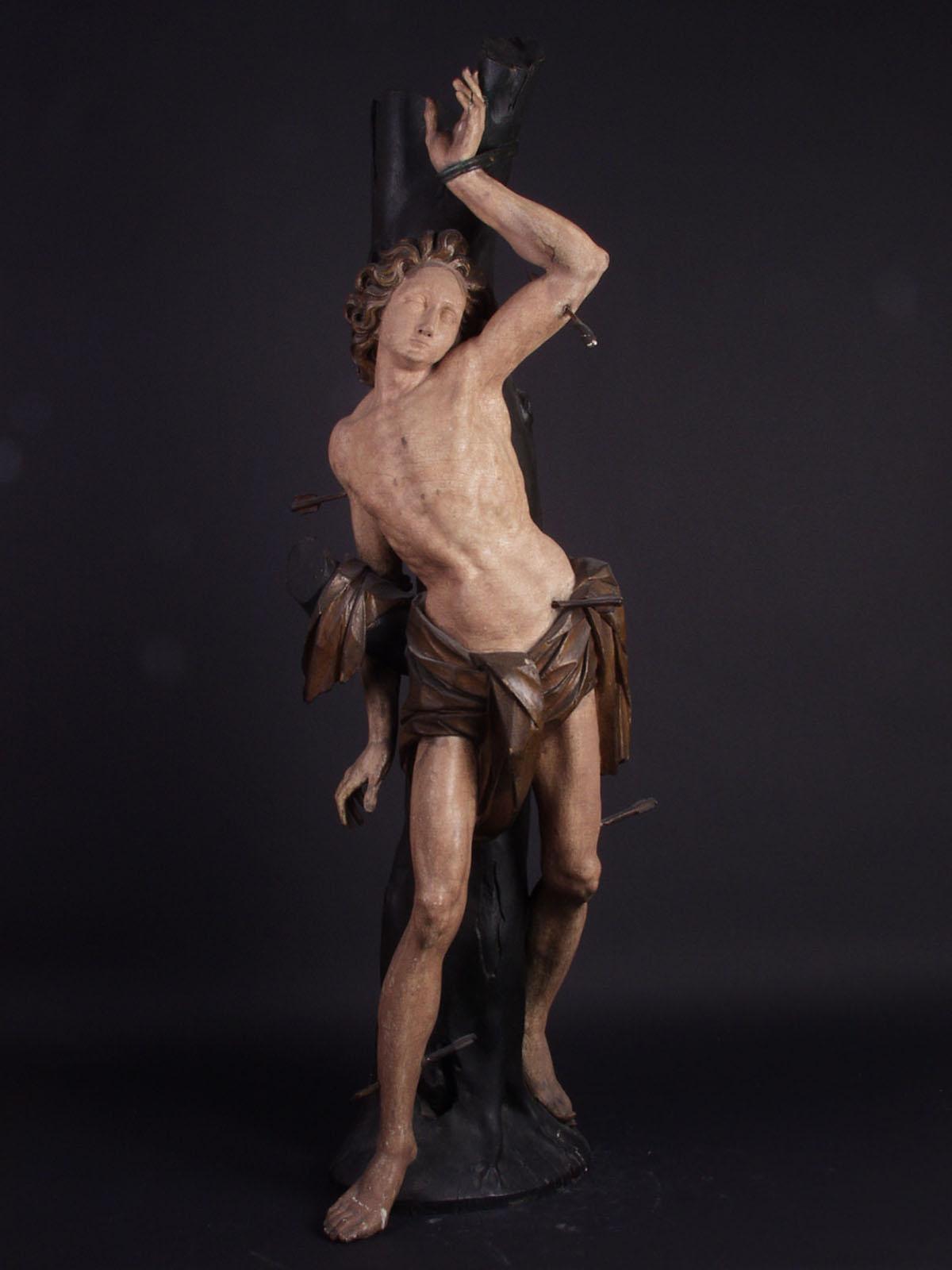 Cette statue en bois polychromé représente un jeune homme largement dévêtu lié à un arbre. Son corps musculeux, décharné et transpercé de plusieurs flèches, se déhanche avec élégance. Ce personnage est saint Sébastien.