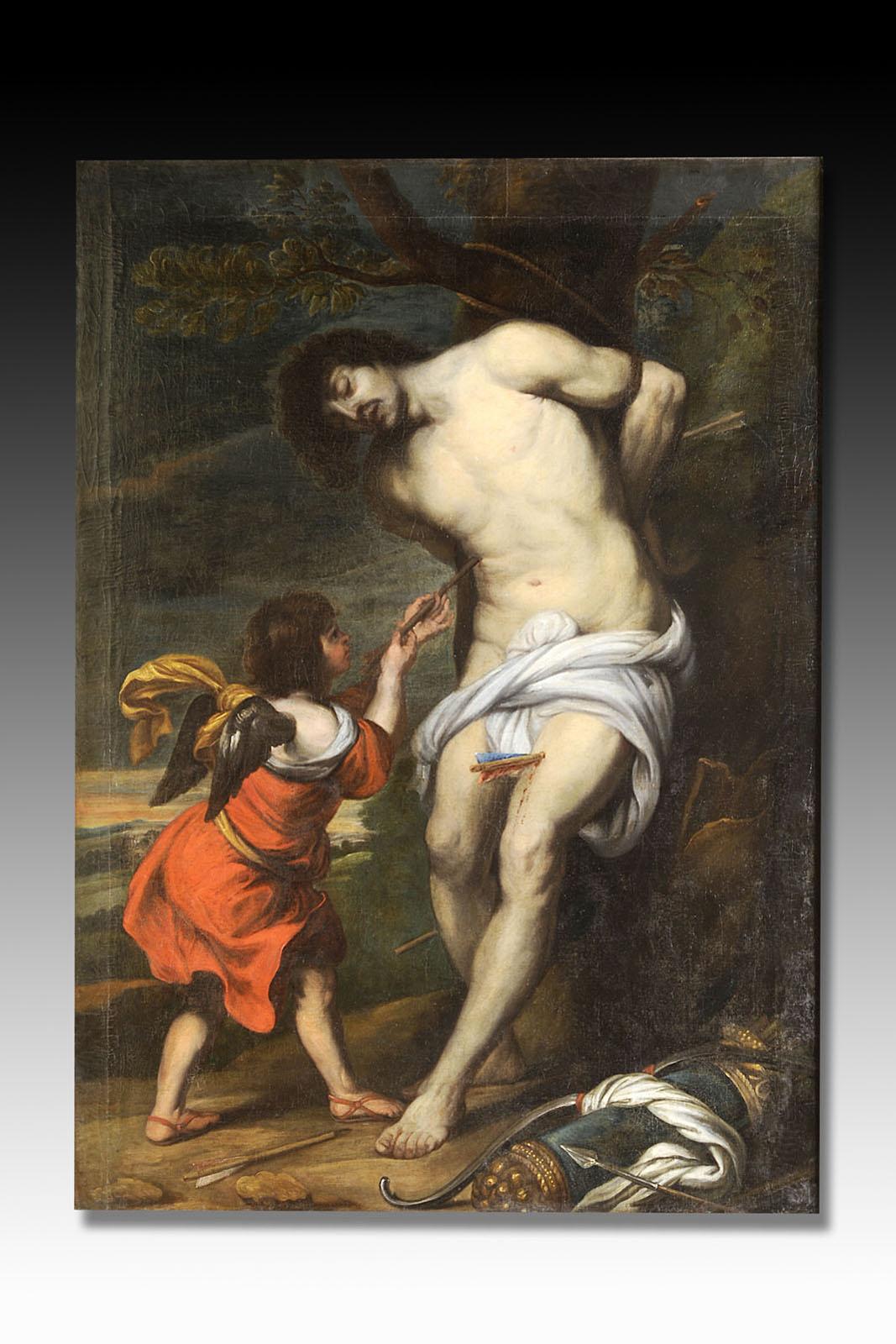 Ce tableau représente un homme vêtu d'un simple pagne attaché à un arbre, son corps pantelant transpercé de flèches. Un arc, un carquois et des flèches figurent à ses pieds, au premier plan de la composition. Un ange, à sa gauche, retire délicatement une des flèches de son corps. Cette peinture représente saint Sébastien après son premier martyr. Membre de la garde de l'empereur Dioclétien, il a secouru de nombreux chrétiens alors persécutés. Découvert, Sébastien est puni en devenant la cible des propres archers de sa garde. D'ordinaire soigné par Irène, il est ici secouru par un ange dont la présence signale que saint Sébastien, témoin insigne du pouvoir de la foi, va triompher des flèches de la mort et survivre à cette terrible épreuve. Il succombera à sa seconde épreuve, la lapidation. Inhumé dans les catacombes, il devient un des saints patrons de la ville de Rome. La grande diffusion du culte de saint Sébastien est liée à la propagation de la peste, fléau contre lequel il est invoqué. Il est en outre populaire dans les régions où le tir à l'arc est une tradition ancienne car son martyre a fait de lui le saint patron des archers.