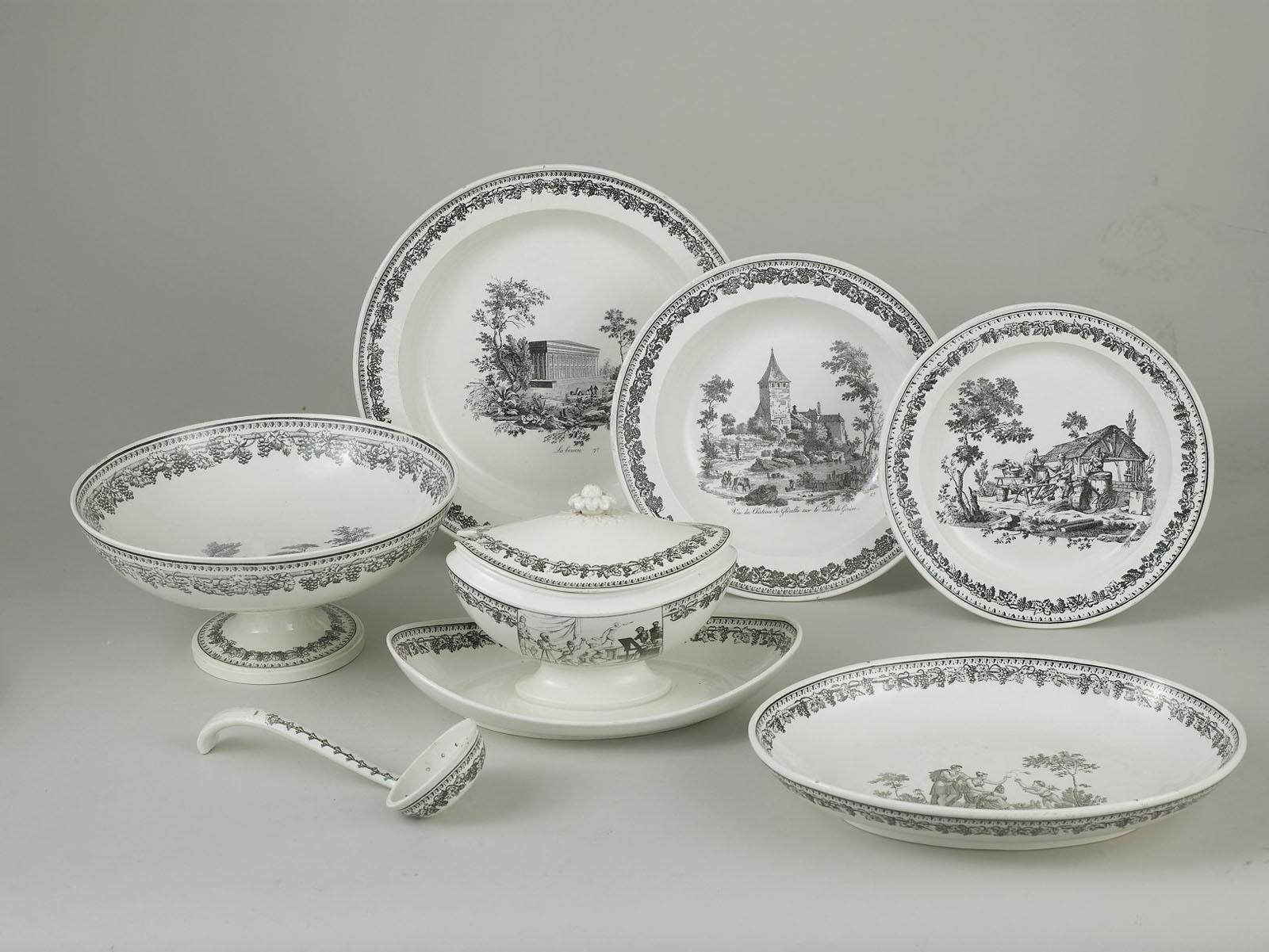 Tous les éléments ont reçu des décors imprimés en noir sur fond blanc, produits par la Manufacture de Legros d'Anizy à Paris, à partir de 1819. La Manufacture emploie pour ses impressions de la « manganèse en mamelon » provenant de Bourgogne. Legros d'Anezy complète l'emploi des plaques de cuivre par celui des blocs de calcaire à grains très fins et polis. Il adapte ainsi à la Céramique le procédé lithographique inventé en 1796 par Aloys Seneffelder, puis breveté à Londres en 1800. La lithographie est une technique d'impression à plat, qui permet des tirages économiques et illimités. La planche gravée sur cuivre devient la matrice. Une première épreuve est tirée sur un papier, puis celui-ci est pressé contre une pierre lithographique tiède à l'aide d'une roulette. L'encre, corps gras donnant le motif pénètre alors dans la pierre.