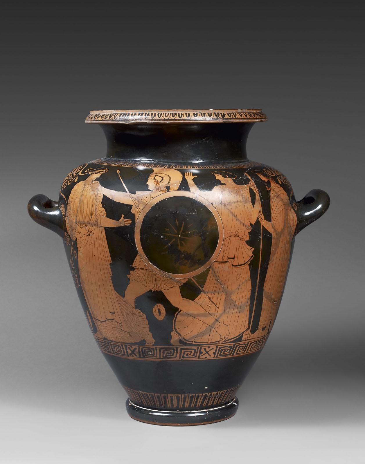 Le dessin est adapté à la forme du vase, les corps sur la panse et les têtes sur l'épaule du vase. Le trait au pinceau, en noir sur le fond ocre rouge a permis au peintre de rendre le mouvement des vêtements dans la course, la dynamique du guerrier et l'effroi des femmes dans l'attitude désordonnée des membres.