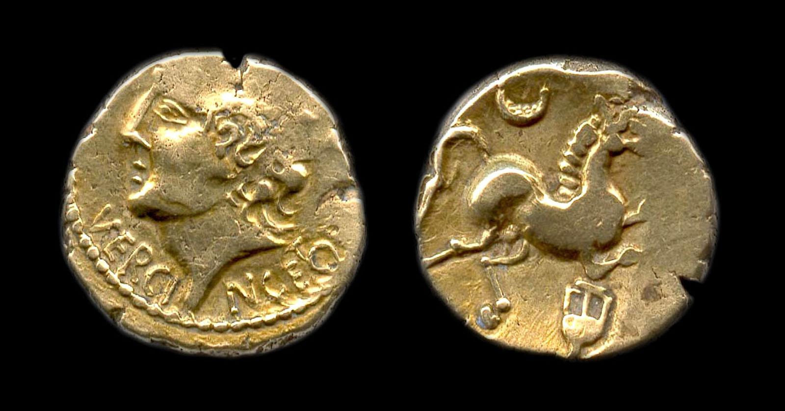 Sur la présente monnaie le sujet est d'abord identifié par la légende en lettres latines VERCINGETO [RIX] qui ne laisse aucun doute sur la pièce : cette monnaie fut frappée sous l'autorité du chef gaulois en 52 av. J.-C., alors que l'arverne Vercingétorix affronte les armées romaines de Caïus Julius César. Moins d'une trentaine de statères de Vercingétorix en or, en électrum et en bronze sont recensés aujourd'hui dans le monde.