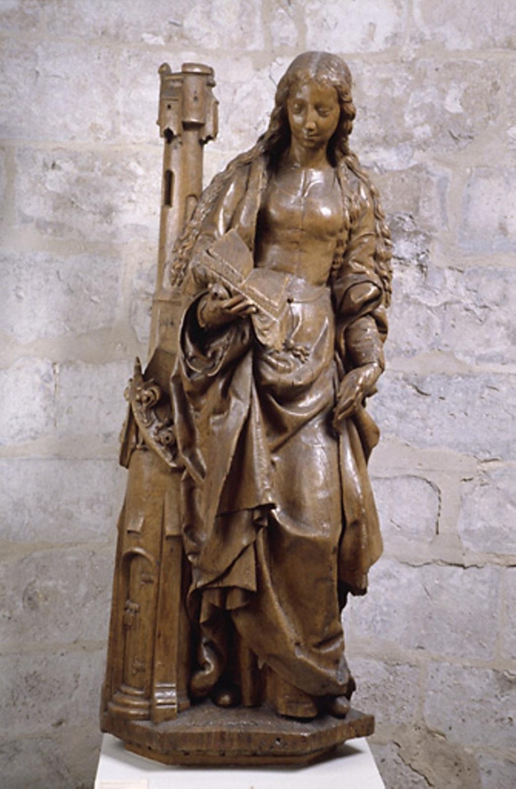 La sculpture, qui provient de la cathédrale de Beauvais, est attribuée à Jean Le Pot, sculpteur originaire d'un village près d'Arras, établi à Beauvais où il décède en 1563. Jean Le Pot a notamment réalisé les vantaux des portails de la cathédrale ; sa famille était alliée aux Leprince, maîtres-verriers. Cette statue aux formes robustes et aux drapés généreux montre la force d'une tradition médiévale d'inspiration flamande qui se perpétue dans le Beauvaisis en plein XVIe siècle. La sainte est vêtue d'une cotte très simple et d'une robe aux plis mouvementés. Ses longs cheveux couvrent ses épaules. Elle s'appuie sur une tour, tient de la main droite les saintes écritures et de la main gauche, la palme du martyre, aujourd'hui disparue.