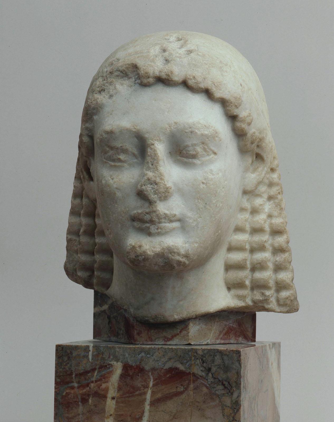 Le jour où la sculpture cessera de sourire, l'art classique sera né. Les oreilles sont d'un dessin remarquable. Tous ces détails se fondent dans l'ensemble et donnent l'impression d'une grande habilité. La chevelure est également composée, son traitement, archaïque. Le crane est lisse, ceint d'un bandeau qui retient les boucles, faisant disparaître la nuque sous leur masse. Une rangée de grosses boucles en coquille cerne le front et les tempes, boucles traitées en relief assez fort. Sur la nuque et de chaque côté du cou, la chevelure est divisée en mèches traitées en rubans plats et gaufrés. Elle apparait sous la forme de trois longs rubans ondulés.