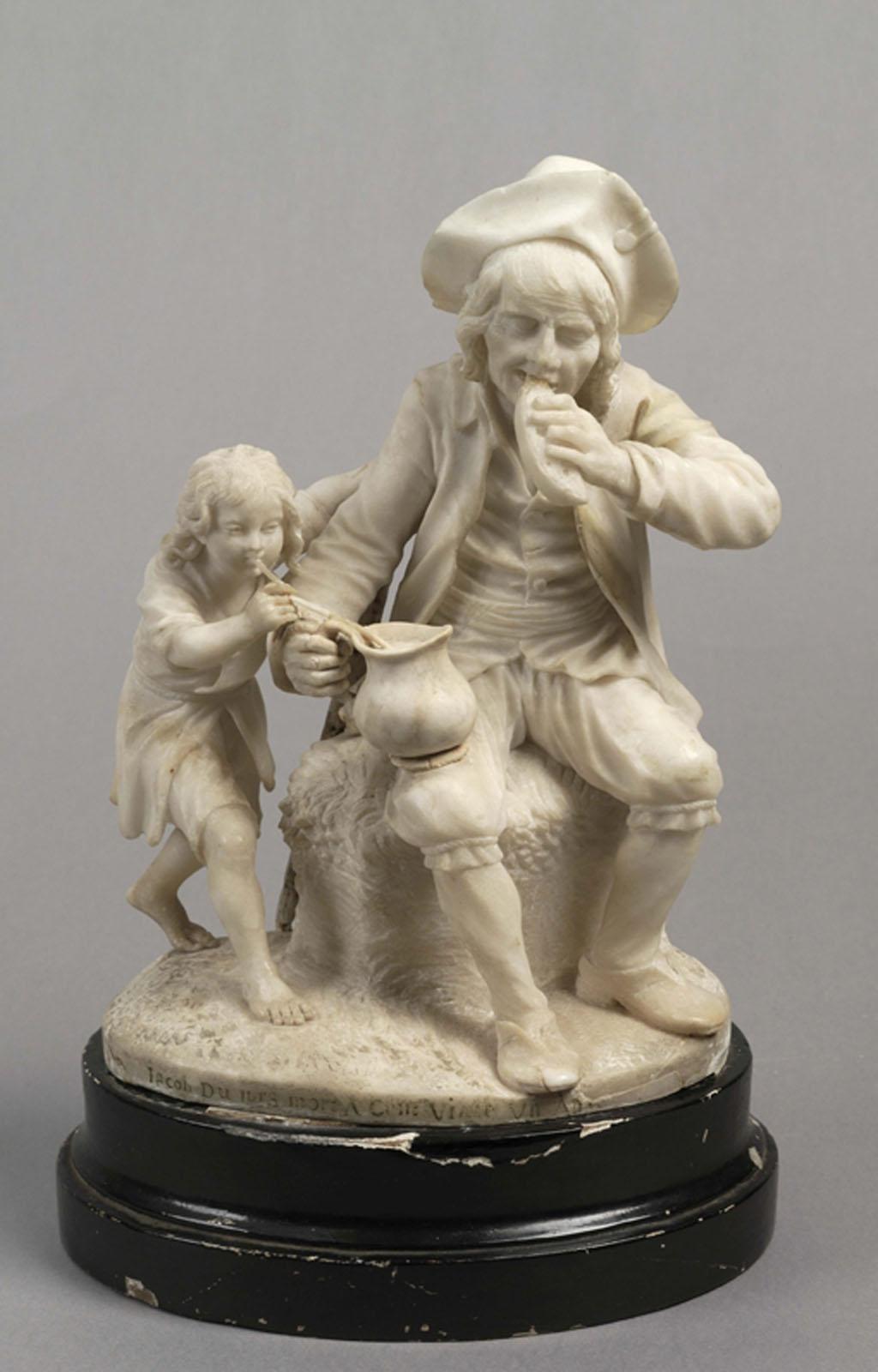 Cette représentation d'un vieil homme assis, portant à sa bouche un morceau de pain (?) de la main gauche, tout en serrant de la main droite une cruche dans laquelle un jeune garçon boit à l'aide d'une paille, à son insu, n'est pas une scène paysanne. On peut en effet lire sur la base l'inscription « Jacob Du Iura mort A Cent Vinte An AD ». Il s'agit d'une rare représentation de Jean Jacob, réputé doyen des Français (1669-1790), qui fut présenté à la famille royale et à l'Assemblée nationale et a joui d'une certaine célébrité au début de la Révolution.
