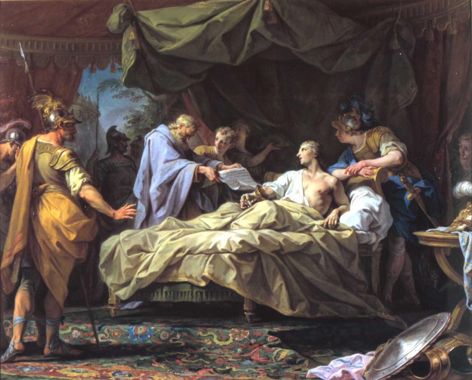 Ce noble sujet faisait en outre probablement écho à la maladie contractée par Louis XV à Metz, en 1744, qui l'amena à renvoyer de la cour un certain nombre de ses proches. Au-delà de son caractère exemplaire, la scène, savamment mise en page, ne manque pas d'humanité : la pose alanguie d'Alexandre lui confère une présence éminemment sensuelle.