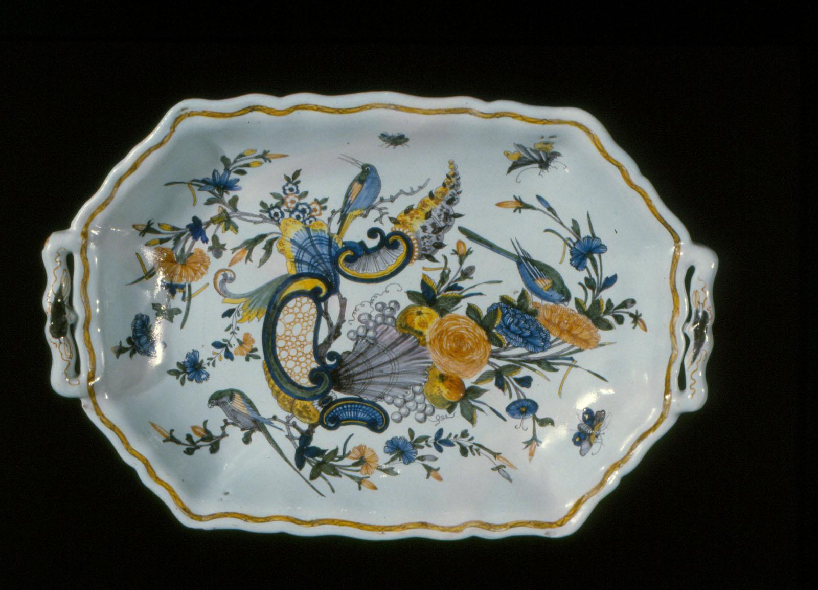 Le décor, d'inspiration extrême-orientale, de coquillages, de fleurs, de fruits et d'oiseaux, perruches à bec court et oiseau exotique à long bec, est entouré d'un filet qui court sur le rebord du plat, occupant tout l'espace, dépassant le fond plat pour occuper les bords. La composition qui pourrait paraître un fouillis désordonné de motifs et de couleurs est en fait très savante. De ce qui autrefois dans les décors originaux était un vase ou un rocher partent deux coquilles l'une vers la droite l'autre vers le haut, créant deux axes desquels naissent le décor de fleurs et de fruits. Trois oiseaux s'y posent, délimitant un triangle qui attire le regard sur l'ensemble de la composition et quelques papillons s'échappent dans l'air.