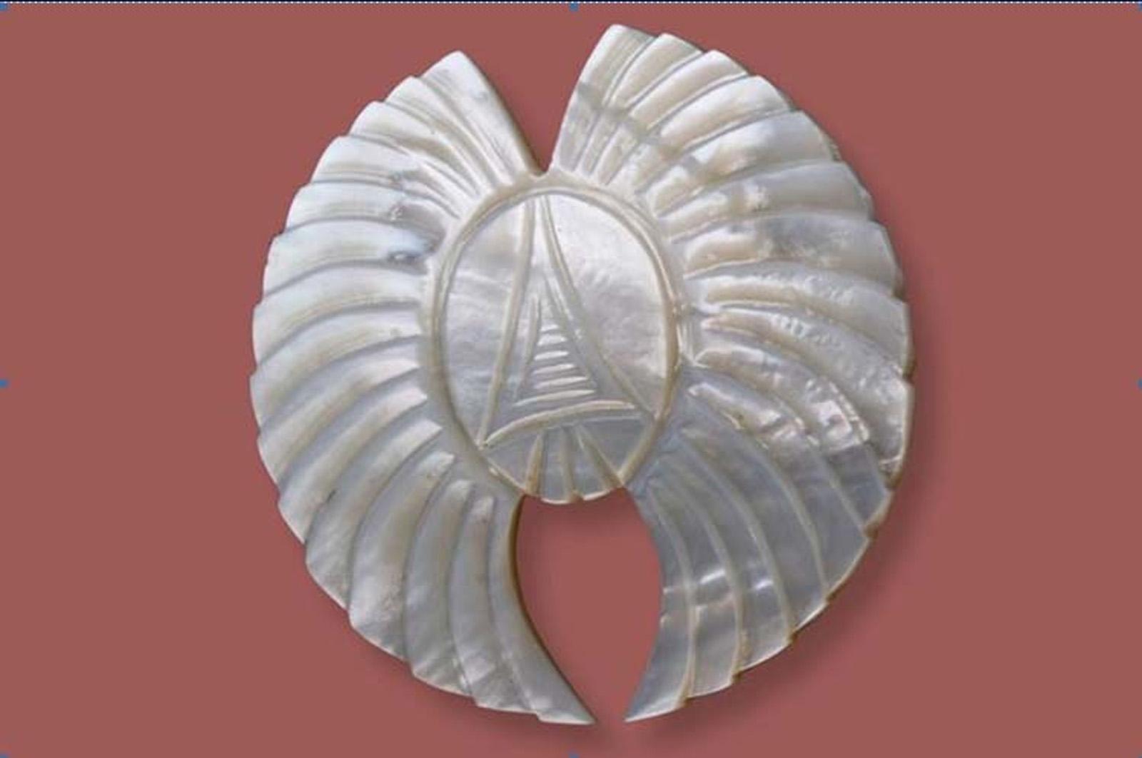 Cet objet est une boucle de ceinture constituée de deux plaques boucles. Celles-ci sont décorées sur la face et pourvues d'un système d'attache au dos constitué d'un passant et d'un crochet métallique. Un relief a été orné en creux et en relief dans la nacre : on y voit un écoinçon au centre et une paire d'ailes. Ce motif rappelle l' Art nouveau ou l' Art décoratif, encore plus épuré.