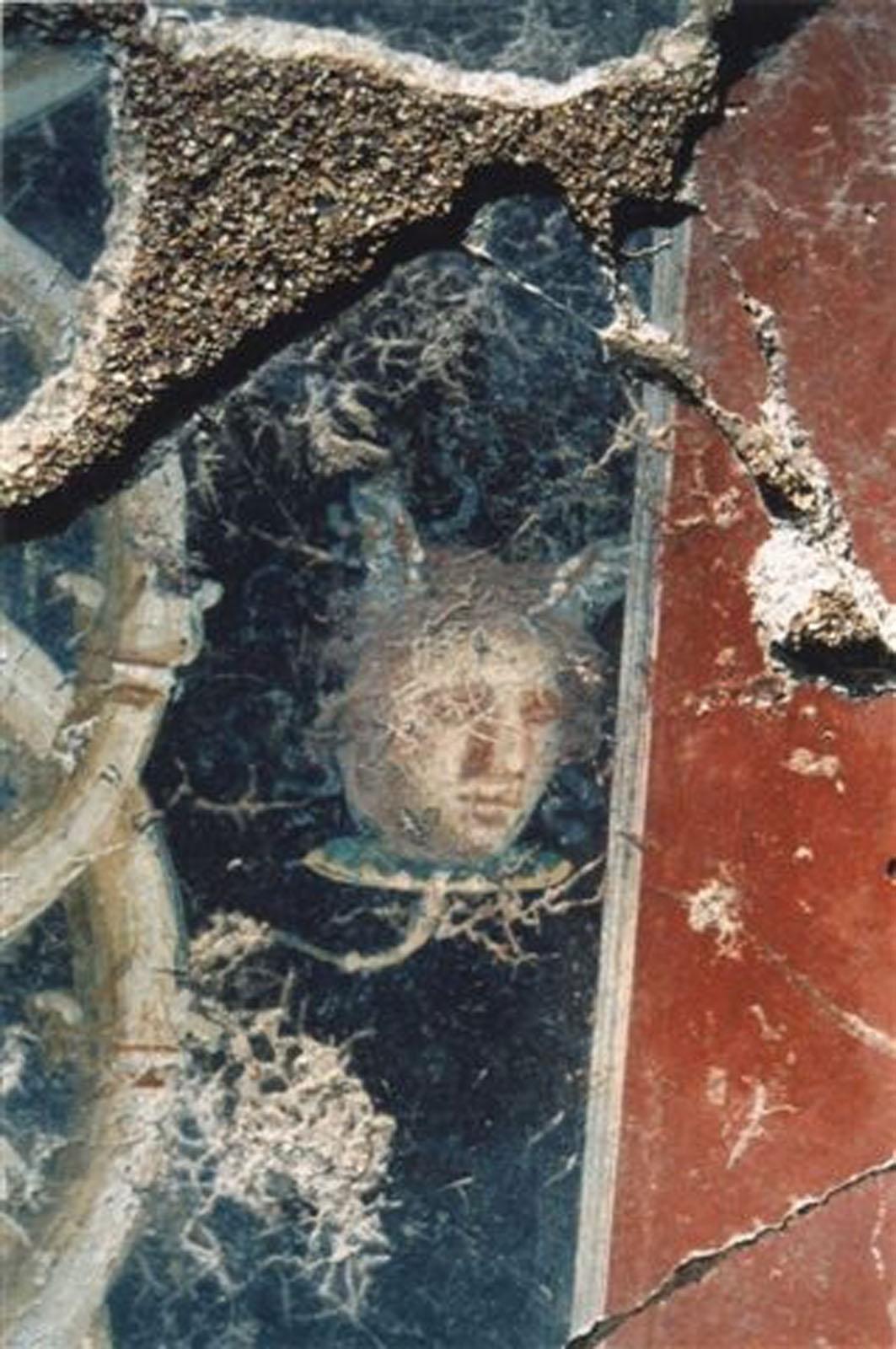 Des tigelles s'en écartent symétriquement, portant figures ou objets faisant allusion à des thèmes mythologiques fameux, en l'occurrence aux légendes de Jason et de Persée : bélier, casque ailé, tête de Méduse – et l'on peut y voir sans doute le rôle apotropaïque des attributs habituels aux héros vainqueurs. Le jaune évoquant le métal doré, joint aux teintes naturalistes des objets annexes, se détachait sur le fond noir en un heureux contraste. Le décor se termine par un entablement peint avec des consoles soutenues par des sphinges schématisées, aux ailes ouvertes. On trouve souvent la zone supérieure de la paroi, très riche en Italie, réduite par les décorateurs gallo-romains, comme ici, à une simple bande de couronnement. La vue en perspective des piédestaux et de l'entablement donne un effet de profondeur et fait reculer le mur opaque en second plan, rappelant le goût des romains pour l'illusionnisme.