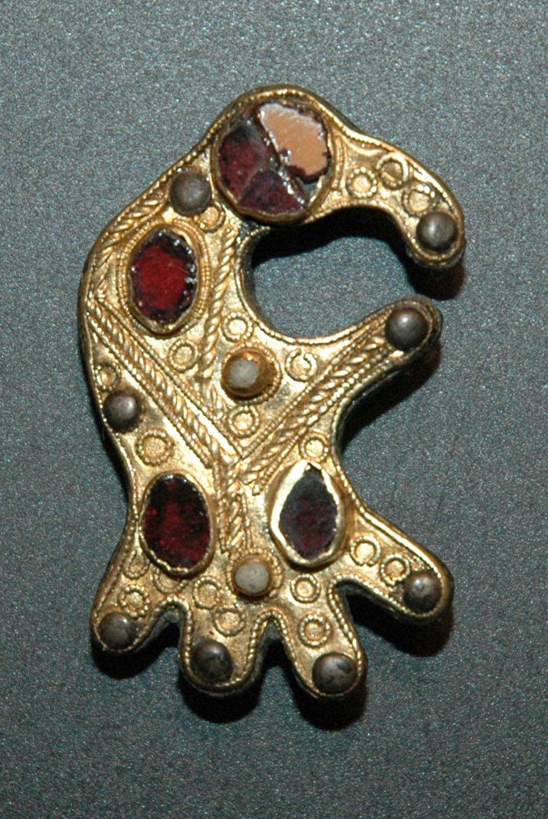 Les deux fibules ont été découvertes dans une riche sépulture féminine, au niveau du buste, en même temps qu’un collier et qu’un bracelet tous deux réalisés en ambre et en pâte de verre polychrome. Ces deux objets représentent des oiseaux très stylisés, des rapaces à bec crochu, tournés vers la droite. Les deux exemplaires sont presque identiques par leur forme avec cependant une variante pour le corps de l’oiseau proprement dit. La représentation de l’oiseau est stylisée : seule l’aile gauche est représentée, très simplement, et le plumage de la queue est simplifié. L’œil de l’oiseau est figuré par une pierre rouge circulaire, ungrenat.