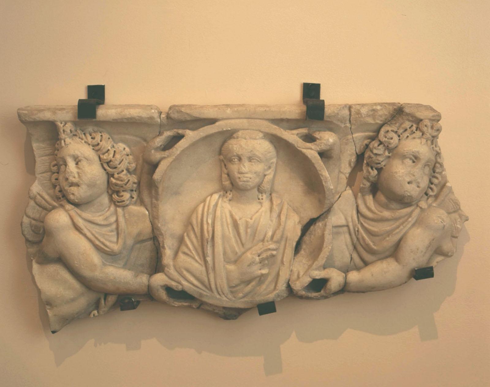 Ce sarcophage était dans l'abbaye Saint-Médard à Soissons jusqu'à la Révolution. Des fragments de celui-ci ont été retrouvés en réemploi dans des bastions militaires puis donnés au musée en 1861, ainsi que d'autres fragments en 1988. On reconnaît ici le côté d'un sarcophage antique semblable à ceux produits à Rome au cours de la deuxième moitié du IIIe siècle. Le visage de la défunte (sans doute sculpté sur place au moment de l'inhumation par une autre main) est au centre d'un médaillon porté par deux génies ailés. Le décor présentait également une femme tenant une corne d'abondance. « Les temps de l'année » (annis tempora) ou Saisons, que les Grecs appelaient les « Heures », sont un thème fréquent sur les parois des sarcophages. Elles représentent la nature féconde et généreuse, cet éternel retour à la vie, cette Renaissance de la mort mais également une vision désabusée de la vie humaine.
