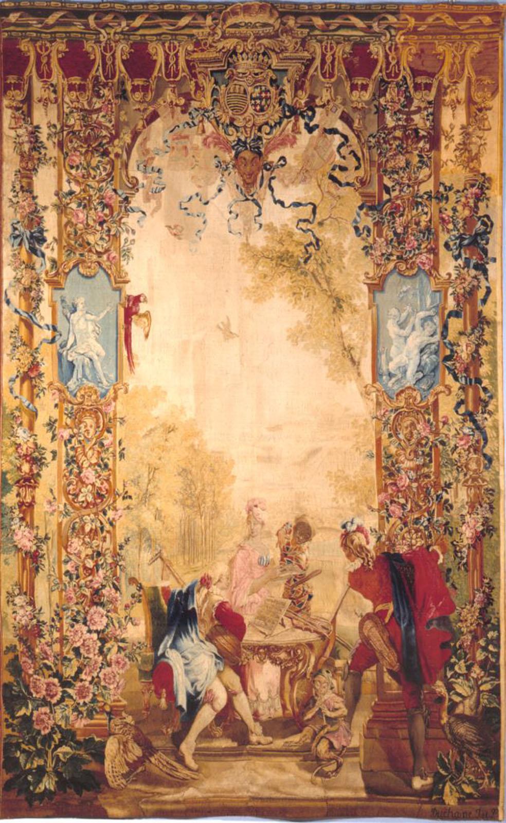 Créée à l'initiative de Colbert en 1666, la Manufacture Royale de Tapisseries de Beauvais connaît une première heure de gloire sous la direction de son directeur Behagle. A la mort de celui-ci en 1705, la Manufacture traverse une période plus difficile marquée par des problèmes financiers et la succession d'administrateurs. C'est dans ce contexte particulier que Joseph Bonnier de la Mosson, Trésorier général des Etats de Languedoc, exemple parfait des grands financiers qui ont fait fortune sous la Régence, commande à la Manufacture, vers 1725, une tenture de six pièces sur le thème de la Comedia dell'arte. Les cartons en ont été réalisés à partir de dessins de Claude Gillot, maître et ami d'Antoine Watteau (1684-1721), célèbre pour ses scènes tirées de la comédie italienne.