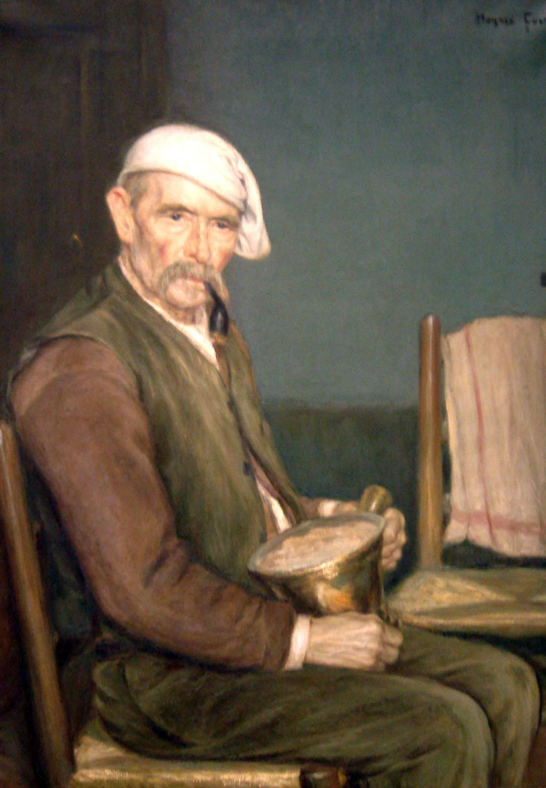 Ici, un homme âgé, en veste, pantalon et bonnet, pose assis sur une chaise. Il tient sur ses genoux un « diable », sorte de pot en métal.