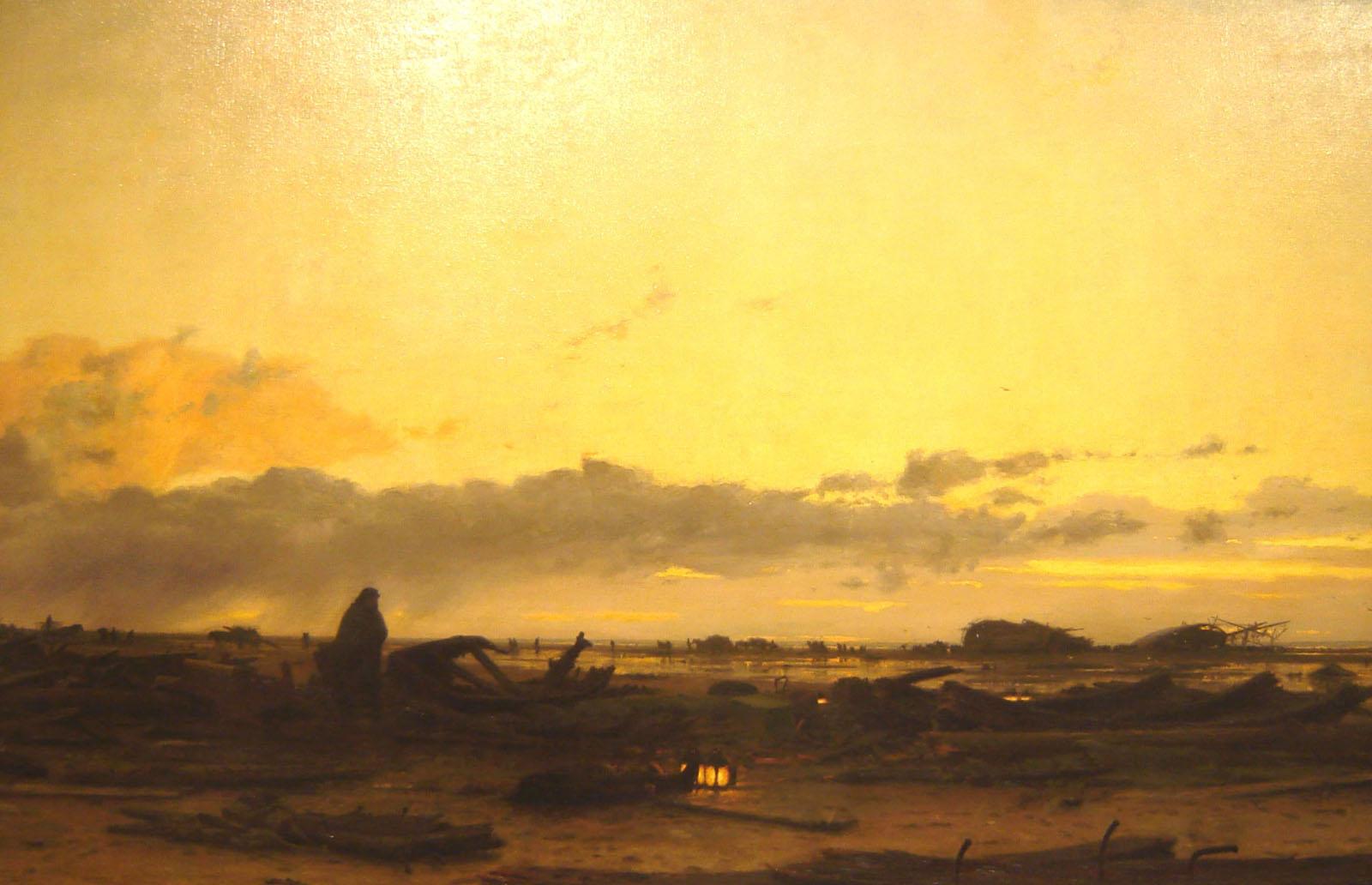 Posée sur l'horizon, la carcasse du Majestas est le point de départ d'un défilé de charrettes chargées d'épaves dans un ballet rapide avant le retour de la marée. Parmi les débris épars du trois-mâts, au premier plan, un douanier veille un cadavre faiblement éclairé par deux lanternes posées à ses pieds. La mer n'a pas seulement disloqué le navire, elle a aussi pris les vies des hommes. >