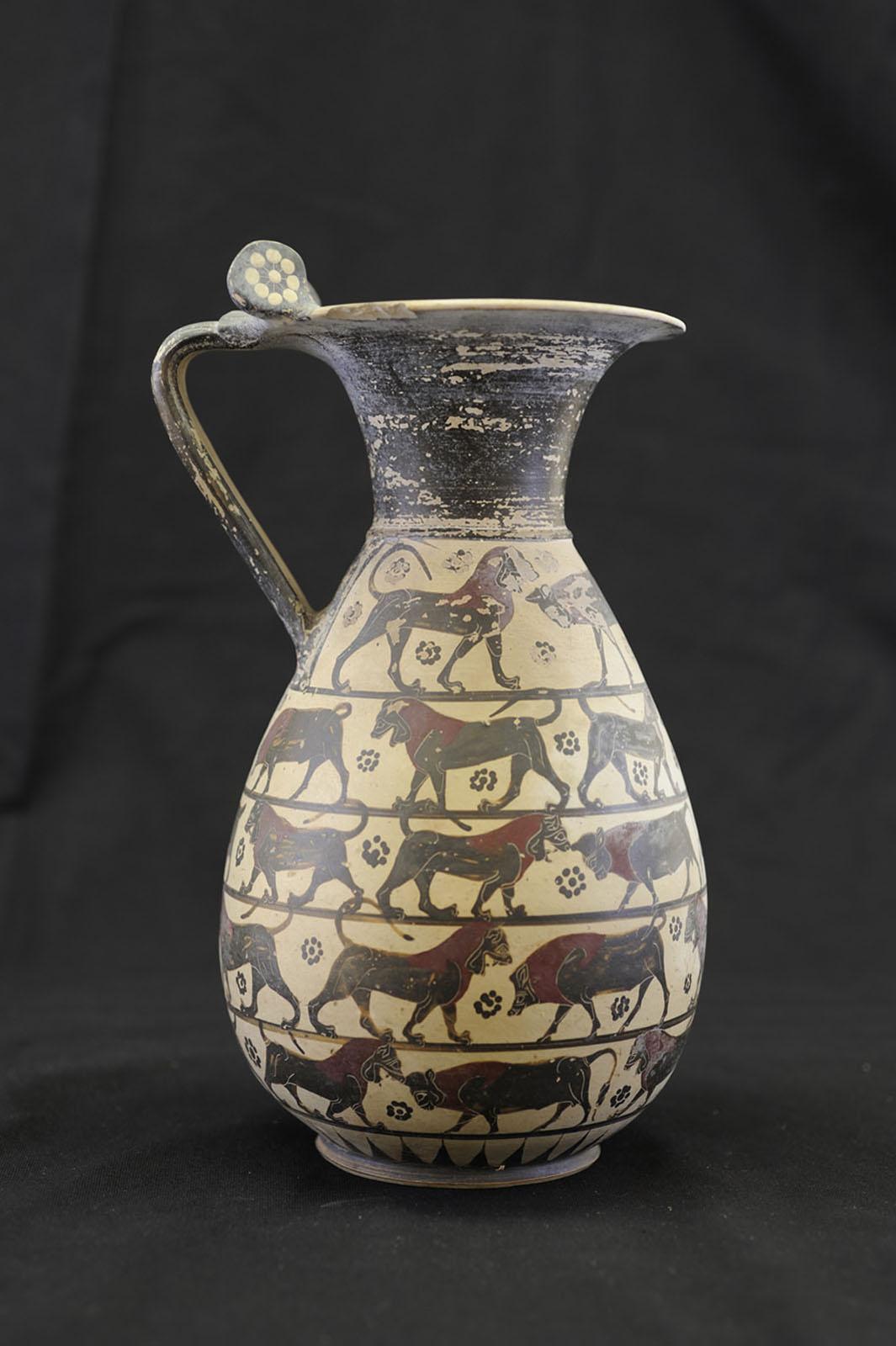 Le col est noir et largement évasé; il s'inspire vraisemblablement de modèles métalliques comme en témoignent les rouelles fixées sur la lèvre, de part et d'autre de l'anse Trifide. La panse est divisée en cinq registres ornés d'une frise animalière regroupant des lions, des sangliers, des taureaux, des panthères, des cygnes, des bouquetins. Les silhouettes traitées en Figures noires et incisées sont rehaussées de rouge. Des rosettes de points parsèment le champ. Un épais filet noir marque la limite entre les différents registres. Une zone d'arêtes rayonnantes se développe à la base de la panse, au- dessus du pied.