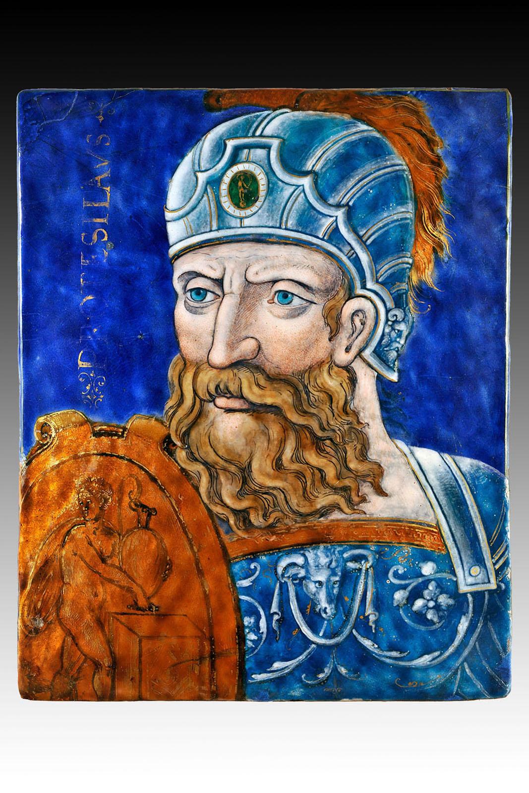 Le portrait imaginaire de Protésilas, premier des princes grecs mort devant Troie, appartient à une série de trente quatre plaques à l'origine, dont six sont conservées au musée de Compiègne avec Briseis, la compagne d'Achille, Thésée, le roi d'Athènes, Ariane, qui l'aida à tuer le Minotaure, Hercule, le héros aux douze travaux, et Médée, qui permit à Jason de ravir la Toison d'or. Onze autres pièces subsistent et sont conservées dans les musées d'Ecouen (Déjanire et Pâris), de Blois (Oreste et Jason), du Puy (Hippolyte et Phèdre) de Baltimore (Enée et Didon) et dans des collections privées (Achille, Léandre, Ulysse). Les différentes figures sont inspirées des Héroïdes, livre du poète latin Ovide, qui au Iersiècle av. J.-C. avait imaginé vingt et une lettres d'amour d'héroïnes mythologiques à leurs célèbres amants. Ce livre fut traduit en français par Octavien de Saint-Gelais, évêque d'Angoulême, en 1496. Cette série serait l'œuvre du plus fameux maître émailleur du XVIe siècle, Léonard Limosin (Limoges, vers 1505 – vers 1577). De ses débuts, on connaît peu de choses ; ses premières oeuvres datées indiquent 1533. Il entre au service de François Ier grâce à l'évêque de Limoges, Jean de Langeac, l'un des principaux personnages de la Cour. Il fut valet de chambre du roi Henri II et reçut même le titre de peintre du Roy et ses descendants se prévalurent longtemps de celui d'émailleur du Roy.