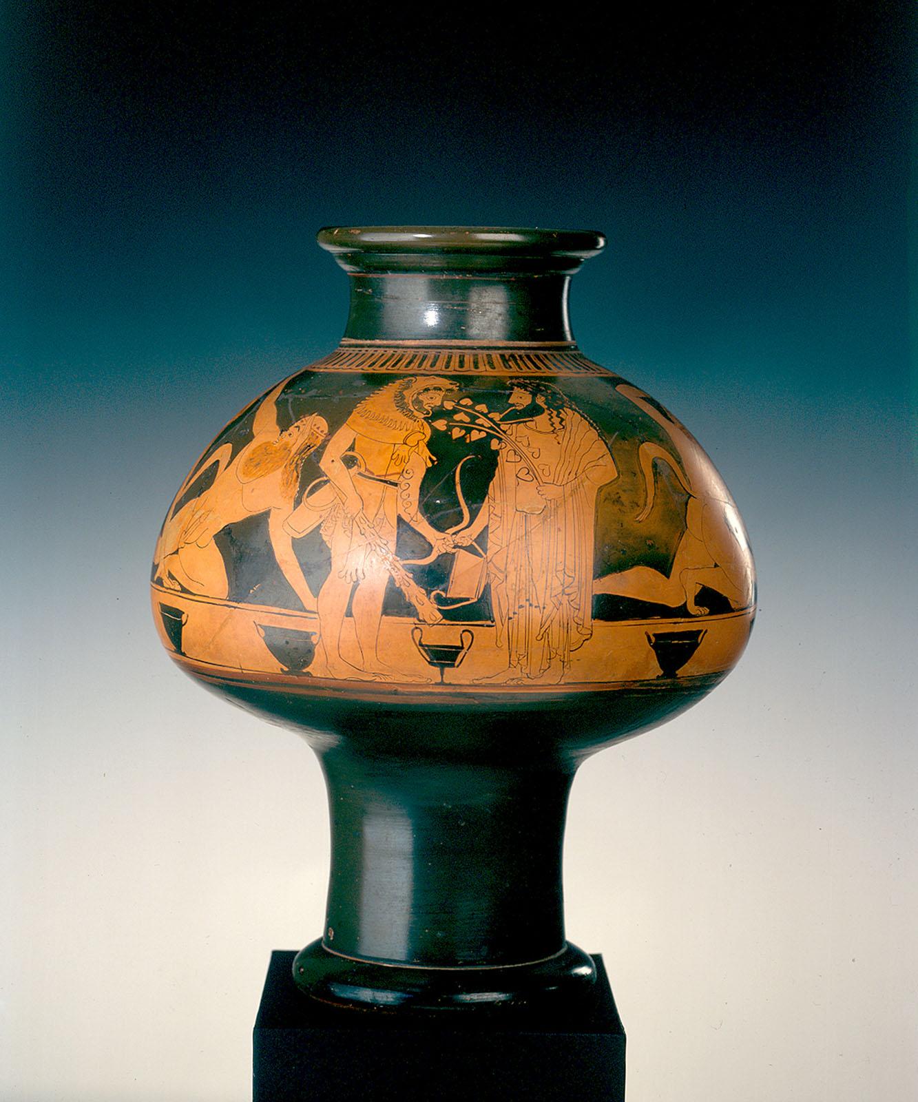 Héraklès, vêtu de la léontè, la peau du lion de Némée, et, armé de sa massue et d'un arc scythe, fait face à Dionysos vêtu d'un himation drapé sur un chiton long et couronné de feuillages, un canthare et un rameau de lierre à la main. Entre les deux personnages, sur le même plan et au même niveau, un canthare est posé à même le sol; il se détache en noir sur une bande réservée. De la même façon, neuf Skyphoï en Figures noires sont répartis sur cette bande autour du vase, Le banquet de six Silènes, ou Satyres, compose la scène du second plan.