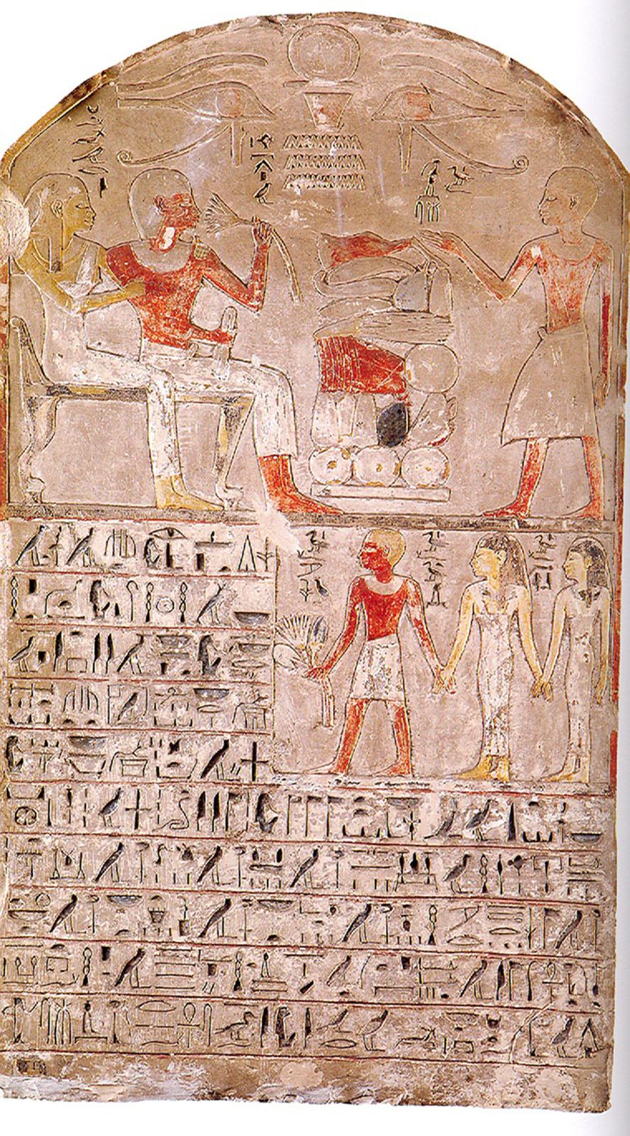 Cette magnifique stèle, par son style et son iconographie est datée du début de la XVIIIe dynastie, jusqu'au règne de Thoutmosis IV. Les deux époux assis sur un canapé et respirant une Fleur de lotus n'apparaissent pas avant cette XVIIIe dynastie. De plus, les noms des différents personnages représenté sur cette stèle sont communs au Nouvel Empire. Les dieux évoqués dans la formule d'offrande peuvent être une indication sur la provenance de cette stèle. Si la plupart des dieux sont des divinités typiquement funéraires, la stèle ne manque pas d'insister sur le fait qu'elle s'adresse aux dieux et aux déesses d'Abydos, lieu d'où proviennent une grande quantité de stèles du Moyen Empire (XIIeet XIIIe dynasties). Abydos devient un lieu de pélerinage pour tous les égyptiens pieux dès la XIe dynastie. Des stèles étaient alors déposées dans des tombes fictives, ou cénotaphes, qui entouraient le mur d'enceinte du grand temple d'Osiris. La tradition du pélerinage et de la stèle à Abydos se perpétua jusqu'à la fin de la civilisation égyptienne.
