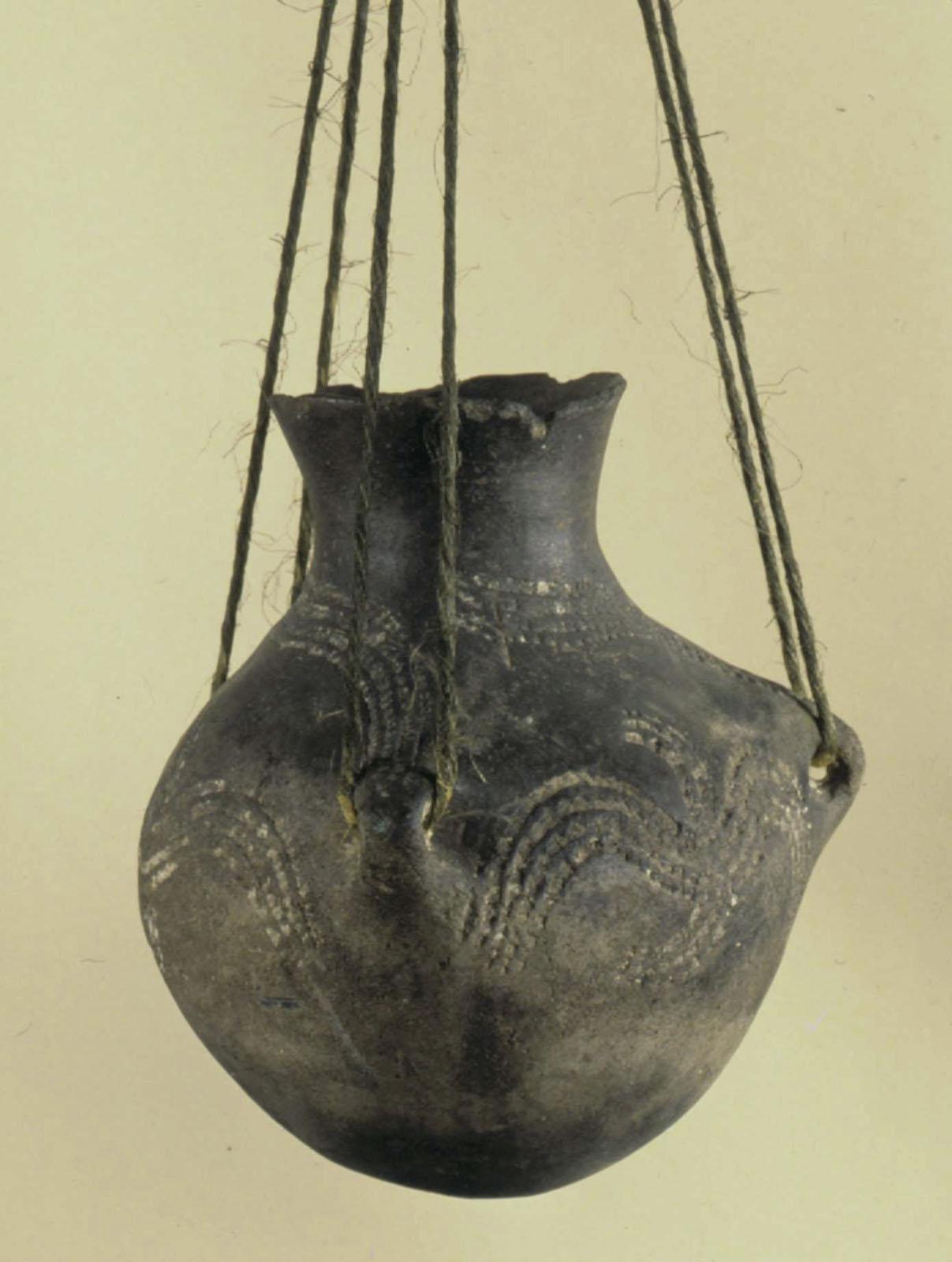 Cette Céramique en terre cuite non tournée est montée suivant la technique du colombin, boudins d'argile roulés à la main et montés ici en bandes superposées.