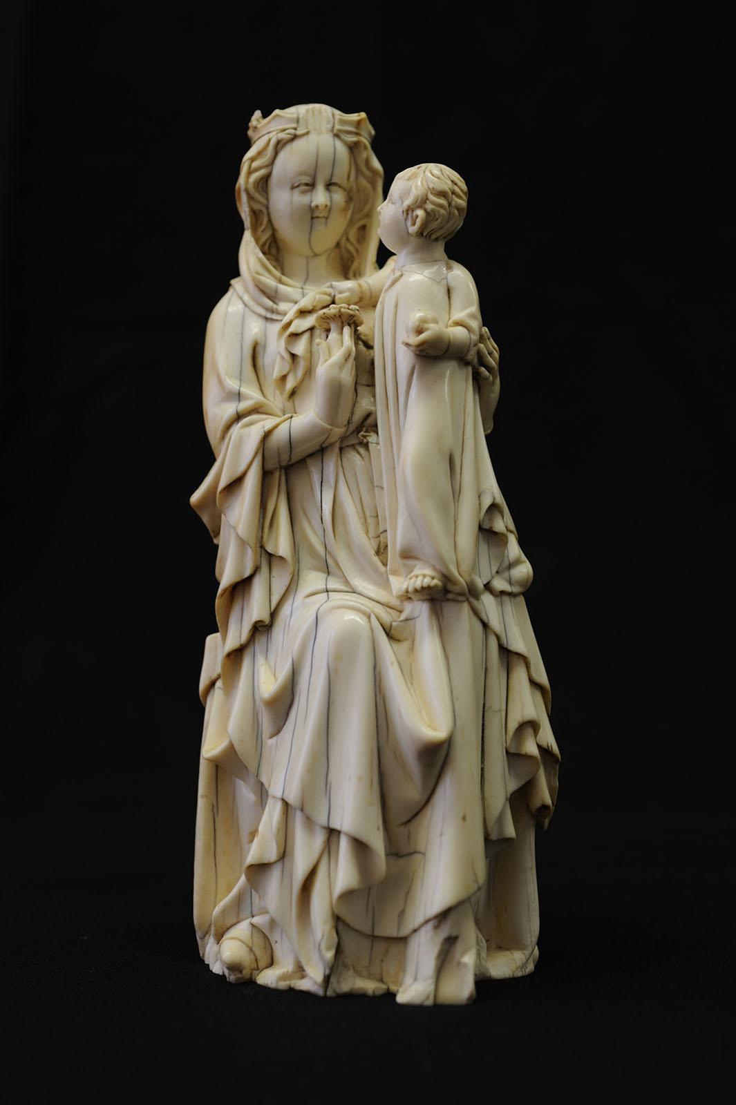 Cette statuette, représentant la Vierge à l'Enfant Jésus, a été sculptée dans une défense d'éléphant. La légère cambrure antéropostérieure est liée à la nature du matériau d'origine. Ce travail dénote une grande virtuosité de la part du maître ivoirier qui a su intégrer son œuvre à la courbure du matériau.