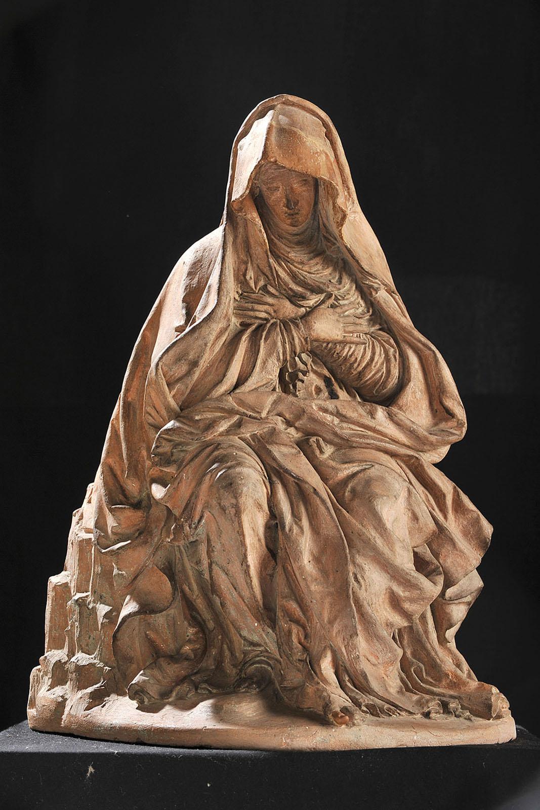 Cette terre cuite représente une femme assise sur un rocher, la tête penchée en avant et les mains croisées sur la poitrine dans une attitude de déploration. Seules les mains et le visage sortent d'une grande abondance de drapés. Il s'agit de la Vierge pleurant la mort de son fils, le Christ. Les drapés, qui semblent vibrer au rythme des sanglots de cette mère éplorée témoigne d'une grande virtuosité dans le travail de modelage.