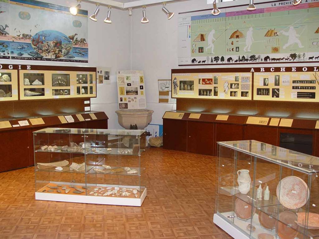 La préhistoire, riche de plusieurs centaines de pièces savamment répertoriées, est montrée à travers l'usage qui pouvait être fait des différents outils lithiques, le plus souvent en silex. Hâches, racloirs et autres perçoirs offre une évocation réaliste et pédagogique de la vie quotidienne de nos lointains ancêtres. Ces deux thèmes sont chacun accompagnés d'une fresque originale retraçant l'histoire de la vie et l'évolution de l'homme.